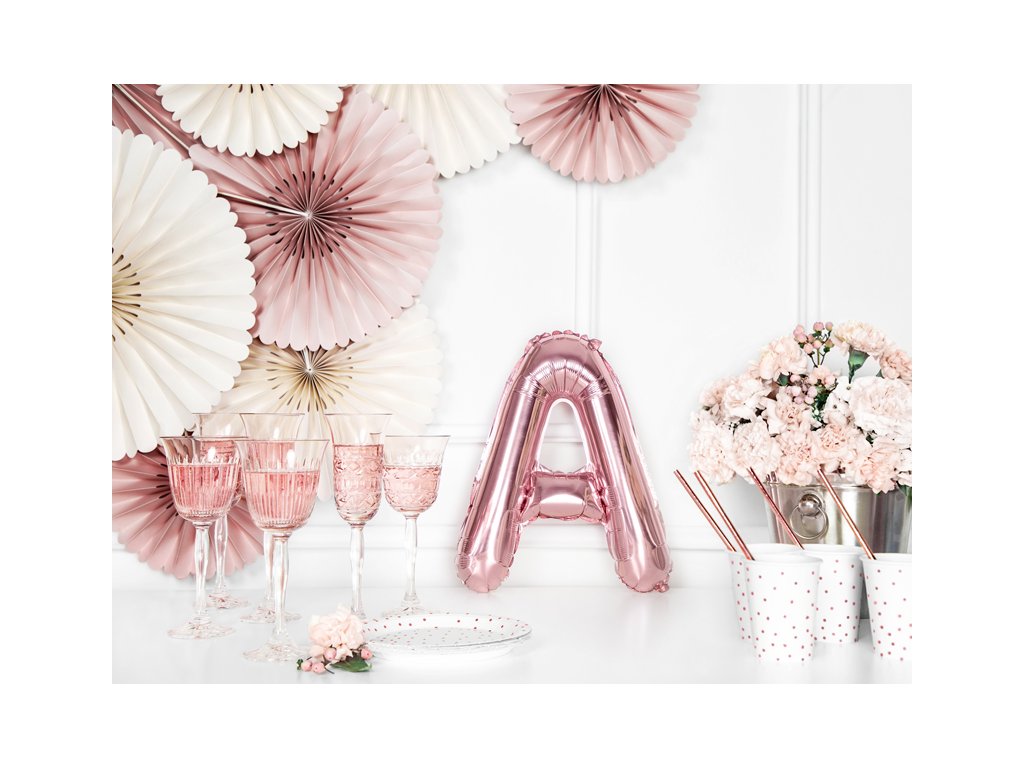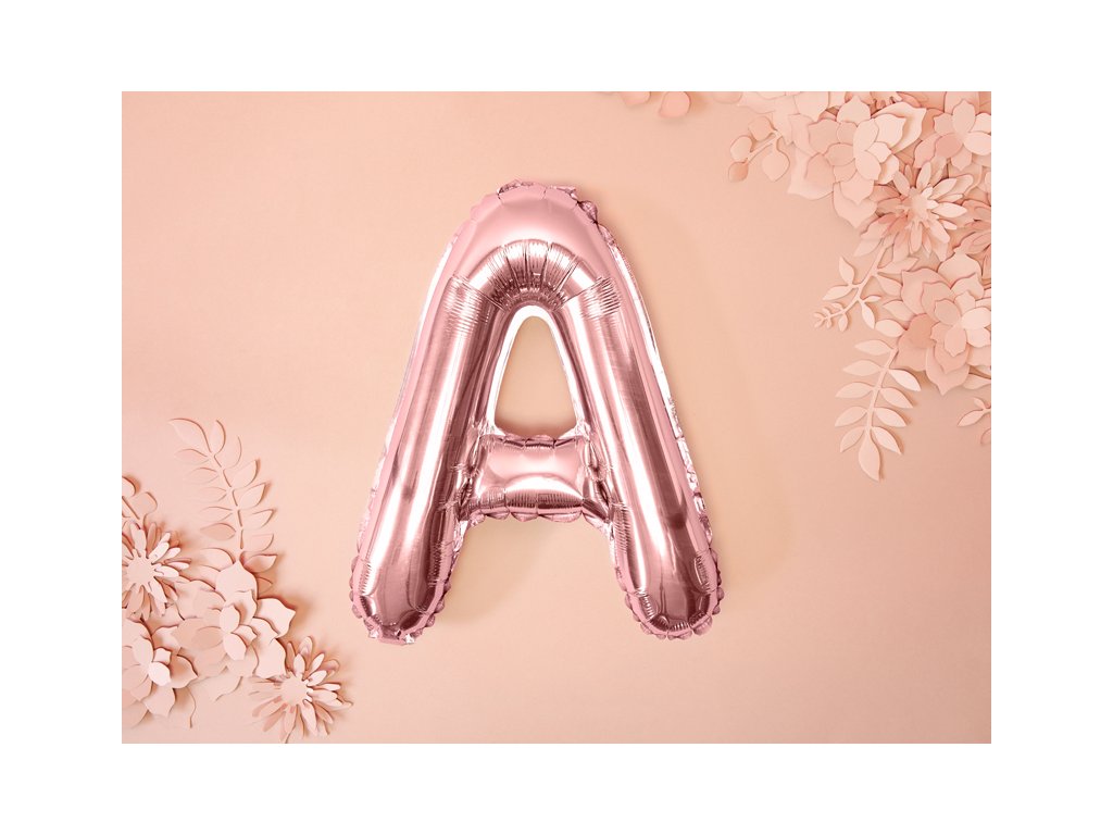 Párty balónek růžovo-zlaté barvy ve tvaru písmene "A" je o velikosti 35 cm. Tento foliový balónek není vhodný pro naplnění heliem, protože se do něj nevleze dostatečné množství helia, aby se balónek vznesl.