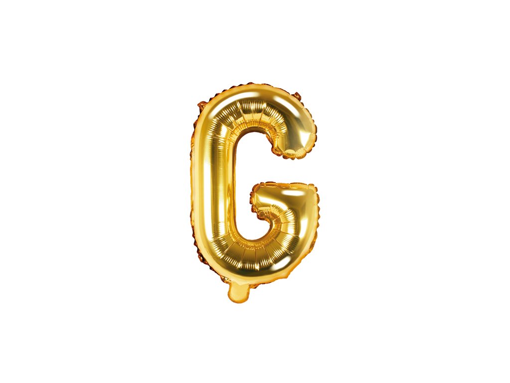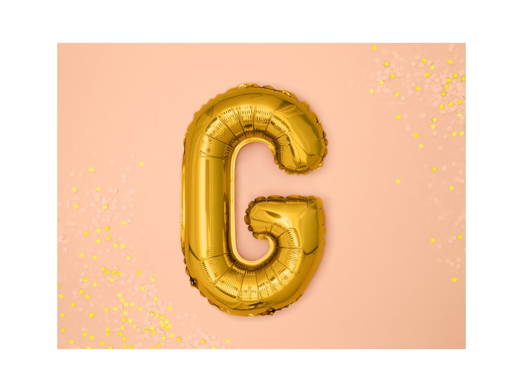 Párty balónek zlaté barvy ve tvaru písmene "G" je o velikosti 35 cm. Tento foliový balónek není vhodný pro naplnění heliem, protože se do něj nevleze dostatečné množství helia, aby se balónek vznesl.