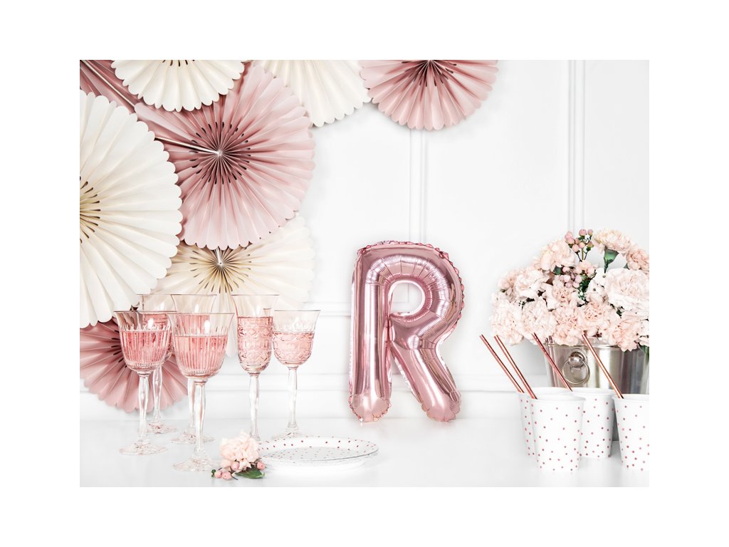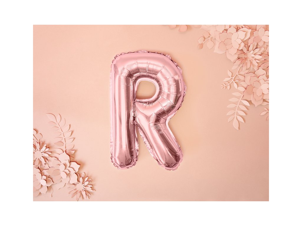 Párty balónek růžovo-zlaté barvy ve tvaru písmene "R" je o velikosti 35 cm. Tento foliový balónek není vhodný pro naplnění heliem, protože se do něj nevleze dostatečné množství helia, aby se balónek vznesl.