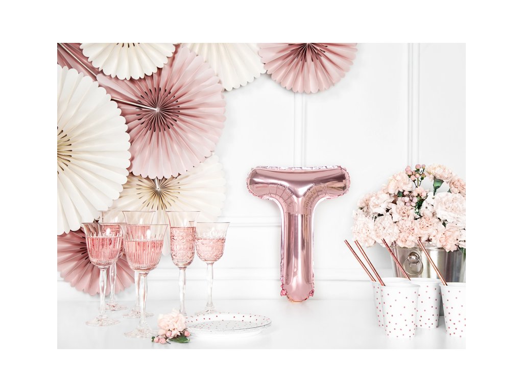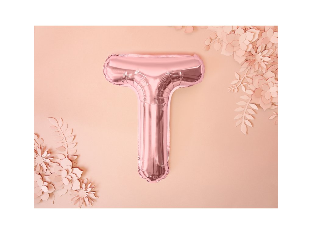 Párty balónek růžovo-zlaté barvy ve tvaru písmene "T" je o velikosti 35 cm. Tento foliový balónek není vhodný pro naplnění heliem, protože se do něj nevleze dostatečné množství helia, aby se balónek vznesl.