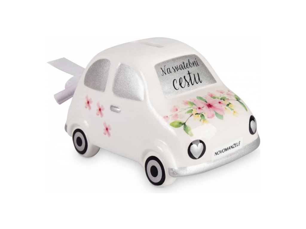 Chystáte se letos na svatbu a hledáte originální a zároveň vtipný způsob, jak novomanželům darovat peníze? A líbí se vám nápad přispět jim na jejich svatební cestu? Tato keramická pokladnička bude tou správnou volbou: peníze můžete vložit dovnitř autíčka nebo roličku bankovky přivázat dozadu nad SPZ Novomanželé. Autíčko má na spodní straně otvor pro pozdější vyndání nastřádaných peněz. Rozměry: 9 cm × 8,5 cm ×15 cm Materiál: keramikaDoplňkové parametry