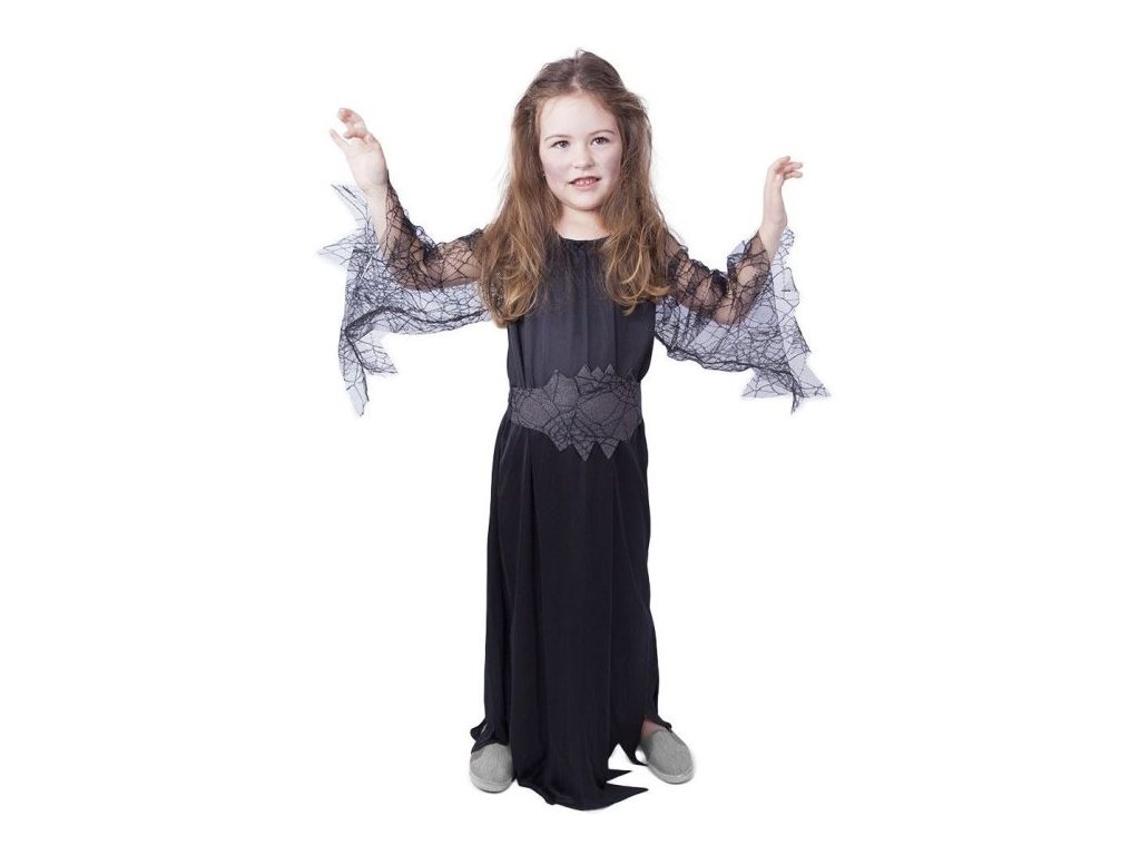 Kostým pro malé čarodějnice! Kostým černé barvy ve velikosti S je určen pro holčičky ve věkovém rozmezí 4-6 let (110-116 cm). Šaty jsou dekorovány průhlednými rukávy s motivem pavučin. S tímto úchvatným kostýmem se zaručeně staneš hvězdou karnevalu!Doplňkové parametry