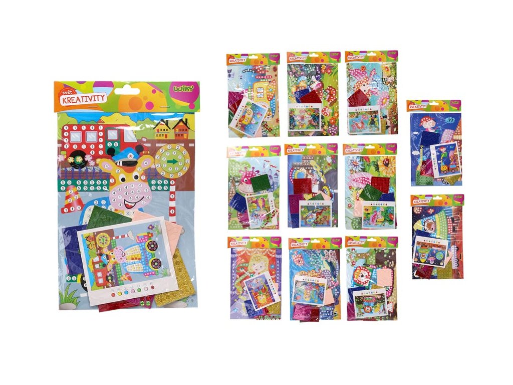 Kreativní set lepení - MIX. Pracuje se na přiložené šabloně, která obsahuje legendu s písmeny nebo číslicemi.Dodáváme v mixu 12 ks v sáčku se závěsem.