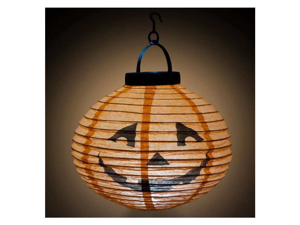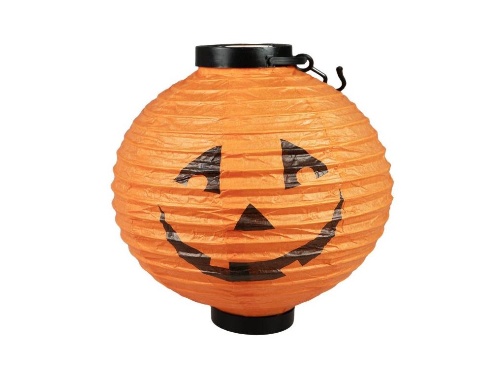 Svítící lampion s motivem dýně je perfektním doplňkem na halloweenskou párty!Lampion má tvar koule, je k zavěšení. Má průměr 19 cm. Tento super kousek zajistí parádní atmosféru na tvém večírku! Lampion svítí po vložení 2 ks baterií typu AAA, které nejsou součástí balení. Rozměr: 19 × 28 cmDoplňkové parametry