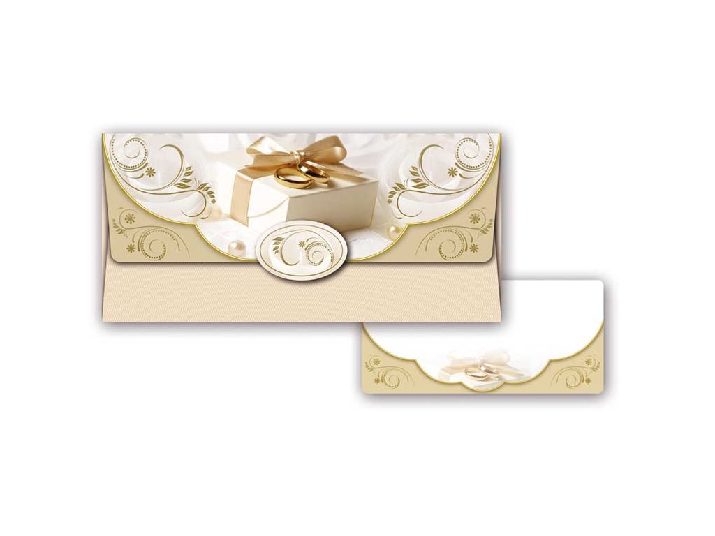 Dárková obálka na peníze - pro novomanžele - Udělejte novomanželům radost a věnujte jim obálku s penězi nebo dárkovým poukazem. Uvnitř je kartička bez textu, na kterou můžete napsat věnování.PROVEDENÍ: béžová s prsteny a dárkem