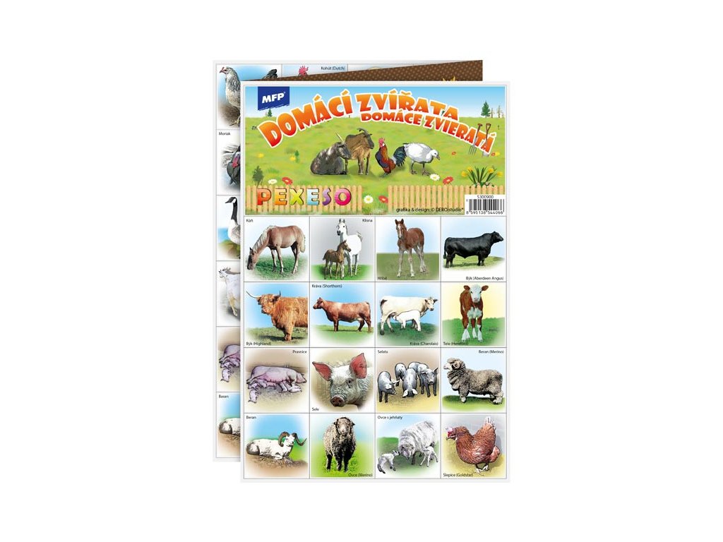 PEXESO je populární dětská stolní hra, která nikdy neomrzí a zapojit se můžou i dospělí. Pexeso - domácí zvířata - nás zavede do prostředí domácích zvířátek. Věděli jste, že slovo PEXESO vzniklo souslovím slov PEKELNĚ SE SOUSTŘEĎ? Výborná učební pomůcka pro děti a rodiče. Naučte své děti poznávat zvířata a procvičujte jejich paměť. Tato hra je zabaví na dlouhé hodiny.Pexeso se skládá ze tří A4, na kterých najdete 64 kartiček domácích zvířat a návod ke hře - na kartičkách jsou názvy zvířat