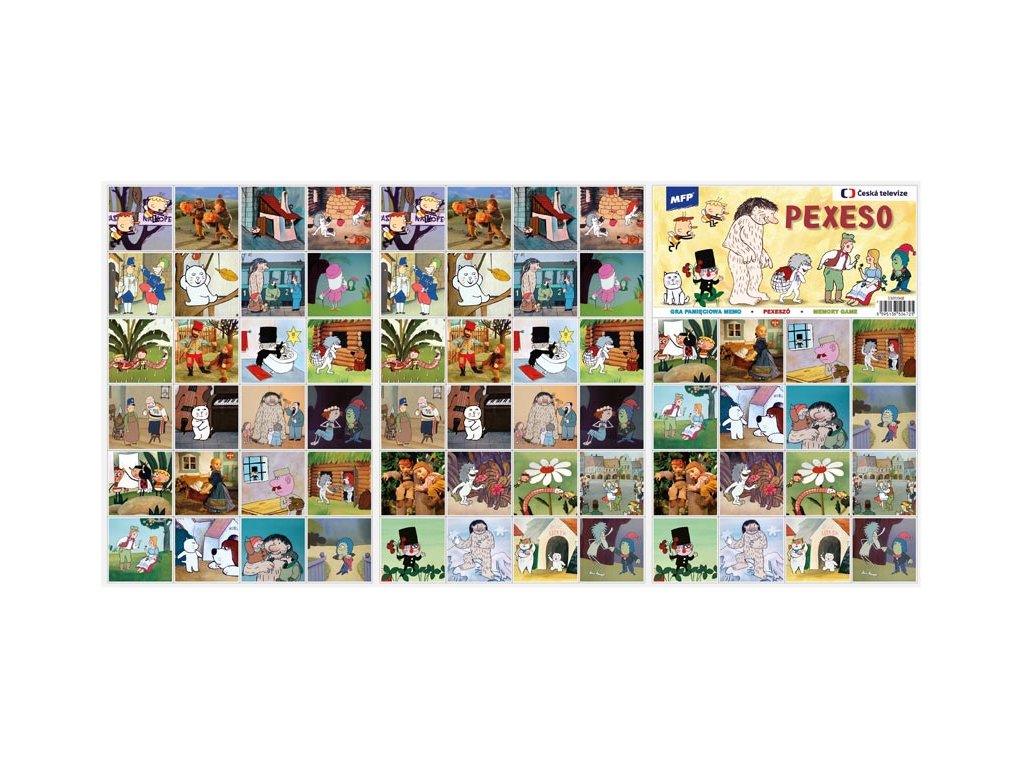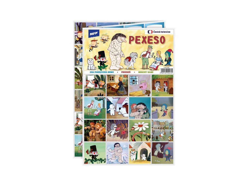 PEXESO je populární dětská stolní hra, která nikdy neomrzí a zapojit se můžou i dospělí. Pexeso - Večerníčky z ČT - nás zavede zpět do pohádkového světa ČT. V pexesu se můžete těšit na příběhy z pohádek O človíčkovi, O Sazinkovi, Chaloupka na vršku, Sněžný muž Hugo, Jak Bzuk a Ťuk putovali za sluníčkem, Vodník Čepeček, O Kubovi a Stázině a Příhody kocourka Damiána. Věděli jste, že slovo PEXESO vzniklo souslovím slov PEKELNĚ SE SOUSTŘEĎ? Výborná učební pomůcka pro děti a rodiče. Naučte své děti poznávat nová slovíčka a procvičujte jejich paměť. Tato hra je zabaví na dlouhé hodiny.Pexeso se skládá ze tří A4, na kterých najdete 64 kartiček obrázků z českých pohádek a večerníčků a návod ke hře.