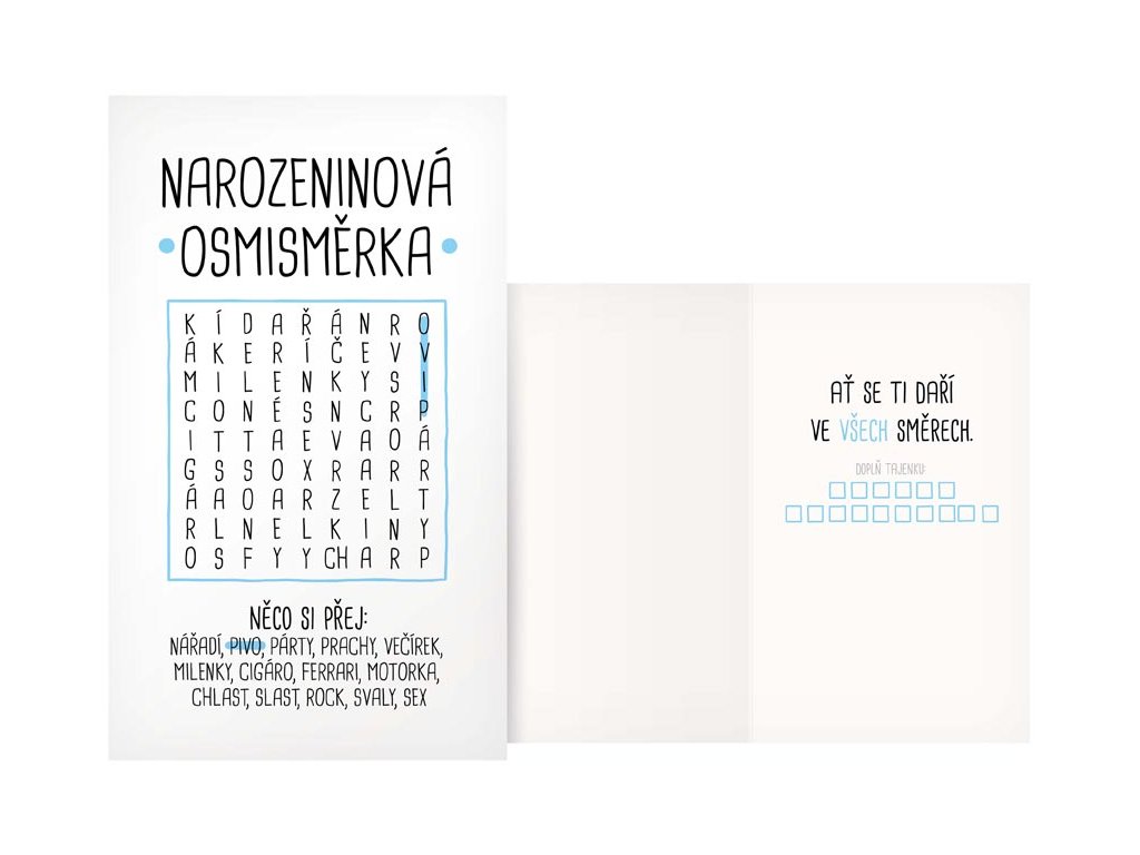 Přání humorné k narozeninám. Přání je s obrázkem osmisměrky, kterou si oslavenec může vyluštit. Oslavy narozenin patří k výjimečným a příjemným okamžikům v životě. Potěšte oslavence a spolu s dárkem mu věnujte originální a krásné přáníčko, které mu bude připomínat tuto radostnou událost.Text na přední straně:
