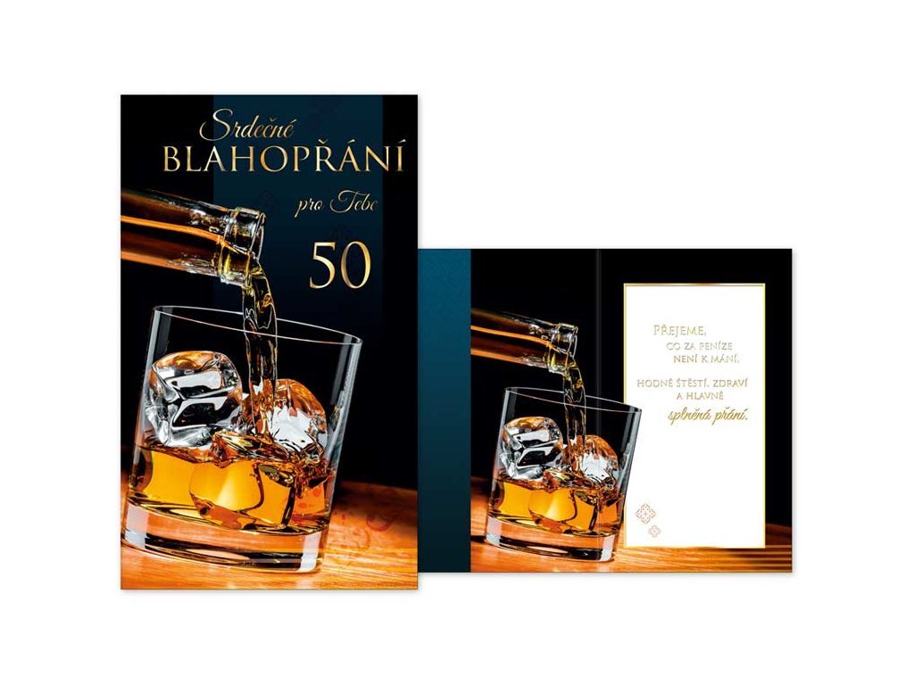 Přání k 50. narozeninám s textem - Oslavy narozenin patří k výjimečným a příjemným okamžikům v životě. Potěšte oslavence a spolu s dárkem mu věnujte originální a krásné přáníčko, které mu bude připomínat tuto radostnou událost. Přání je s obrázkem Whiskey.Text na přední straně přání: