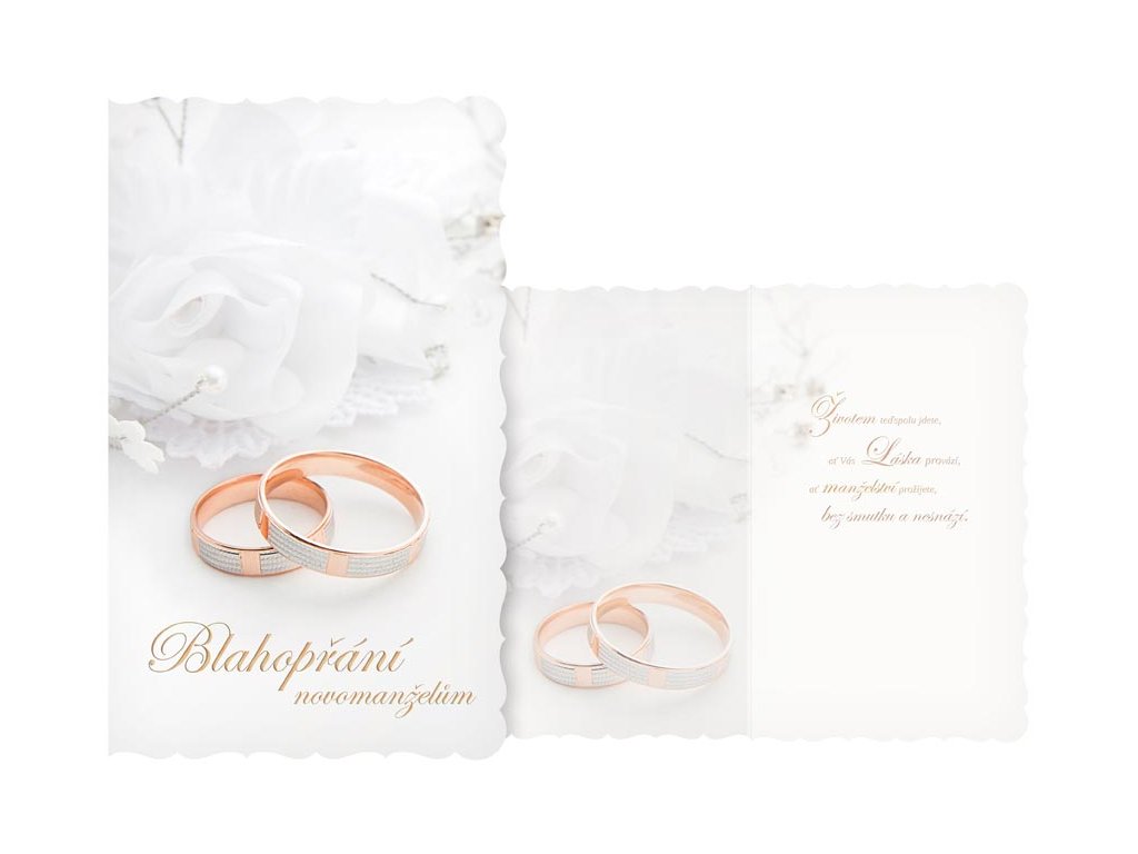 Přání svatební. Krásné svatební přání pro novomanžele s krásným obrázkem, který je určitě potěší. Mezi svatebními dary by nikdy nemělo chybět i přání novomanželům. Udělejte radost novomanželům a věnujte jim přání k jejich svazku, díky kterému si vždy připomenou krásné začátky jejich manželství.Text na přední straně: