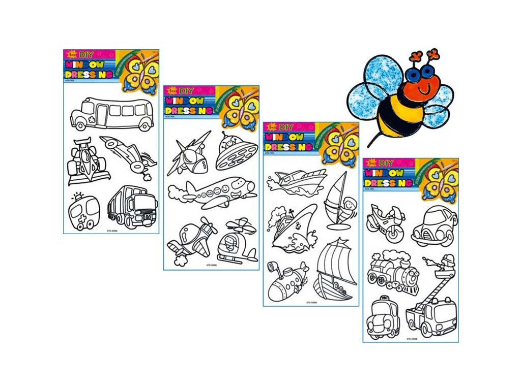 Předloha k barvičkám na sklo na adhezní fólii - Udělejte si pohodové odpoledne s dětmi, překreslete si obrázek pomocí těchto šablon, který si pak můžete umístit na Vaše okno.Provedení: dopravní prostředky