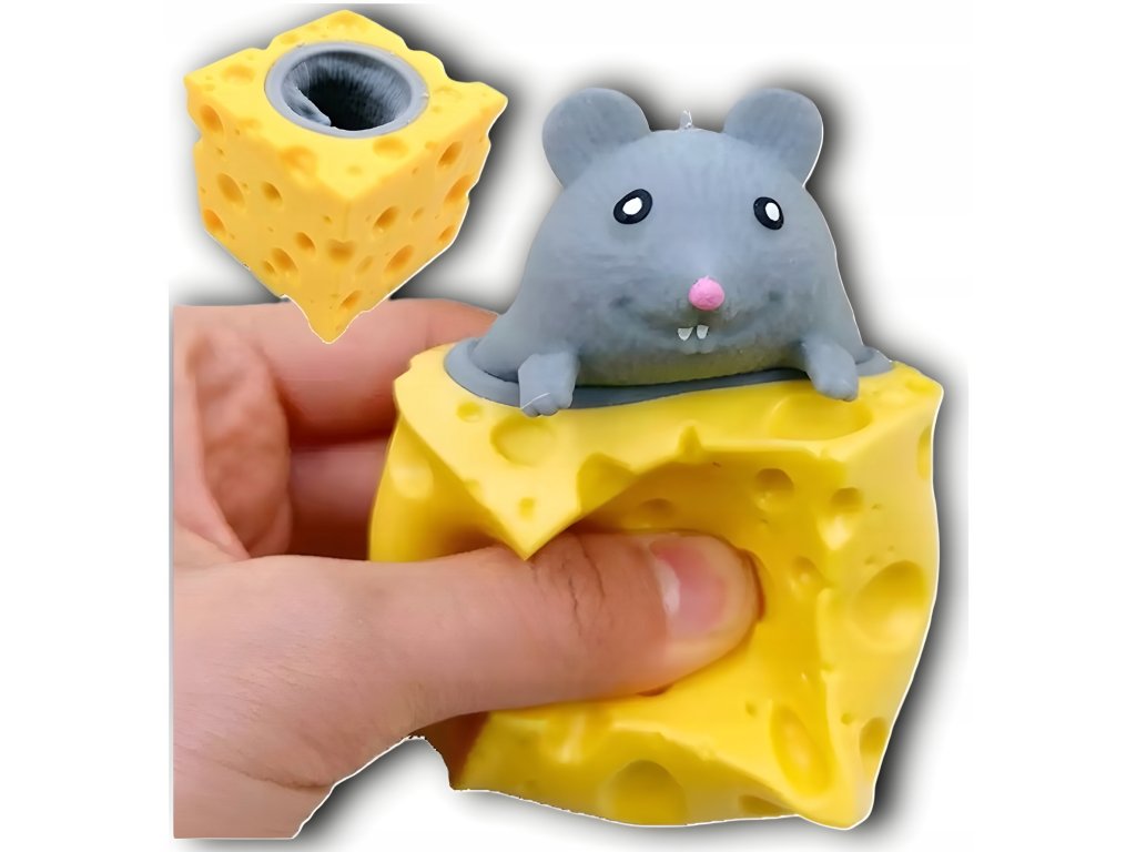 Antistresová hračka, která kombinuje dvě ikonické věci: myš a sýr. Jde o měkkou, mačkací hračku, kde se malá roztomilá myška schovává v kostce sýra plné otvorů. Když na kostku sýra zatlačíte, myška vyleze ven a po uvolnění se vrátí zpět do sýra. Hračka má velmi příjemný dotek a je navržena tak, aby uvolnila stres a zlepšila náladu. Vhodná je jak pro děti, tak pro dospělé, kteří si chtějí pohrát, nebo prostě jen potřebují antistresovou pomůcku.